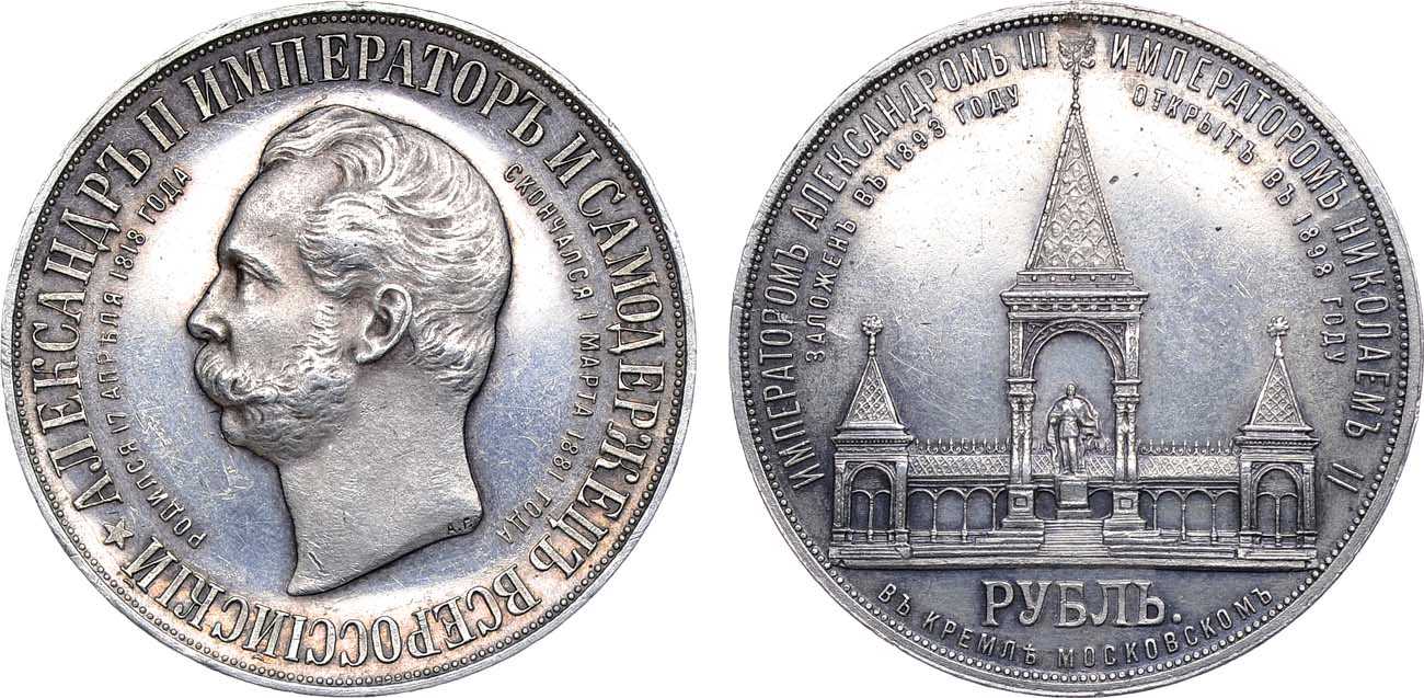 Серебро. 19,97г. Чеканен по случаю открытия памятника Александру II в Москве. На гурте "(А•Г)". Тираж 5000 экз. Уздеников 4191. Биткин 323(R). 4 рубля по Петрову. Казаков 131(R1). UNC.