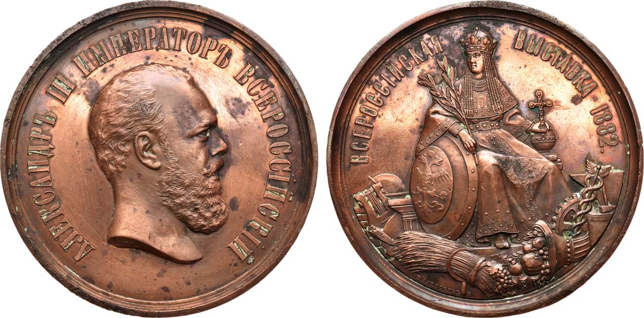 Бронза. 363,28г. Диаметр 93 мм. Санкт-Петербургский монетный двор. Медальеры: аверс — Л.Х.Штейнман (на обрезе: "Л.Ш.Р."), реверс — В.В.Алексеев (внизу, под снопом, у окружности: "В.АЛЕКСѢЕВЪ Р."). Смирнов 860/а. Дьяков 930.1(R0). XF.