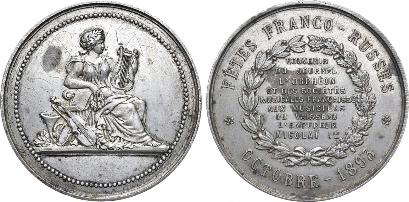 Медаль В память Франко-русских празднований в октябре 1893 года для музыкантов корабля "Император Николай I" от газеты "Орфей" и Французского музыкального общества.