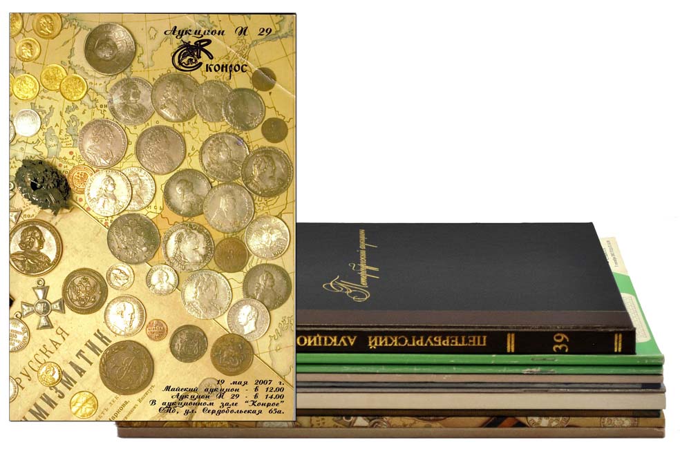 Санкт-Петербург за 1999-2012 годы. Каталоги аукционов № 2 - библиографическая редкость, 14, 16, 20, 26, 29, 31, б/н от 19.03.2011, 39 (в твердом подарочном переплете), 40. Интересные аукционы с большим количеством редких русских монет и медалей.