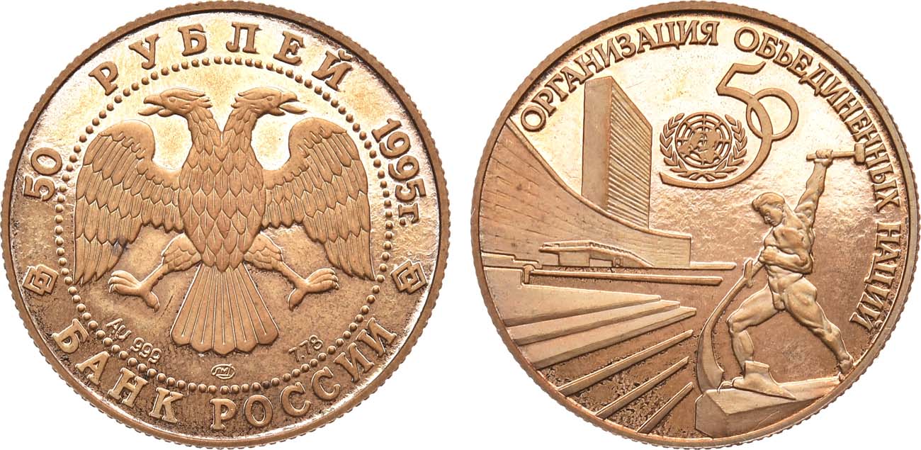 Латунь. 3,93г. Санкт-Петербургский монетный двор. Односторонний оттиск инвестиционной драгметальной (золото) монеты 50 рублей 1995 года. 50 лет ООН. Аверс: как у тиражной монеты. Реверс: гладкий кружок. Гурт рубчатый. Односторонний оттиск инвестиционной драгметальной (золото) монеты 50 рублей 1995 года. 50 лет ООН. Аверс: гладкий кружок. Реверс: как у тиражной монеты. Гурт рубчатый. PROOF.