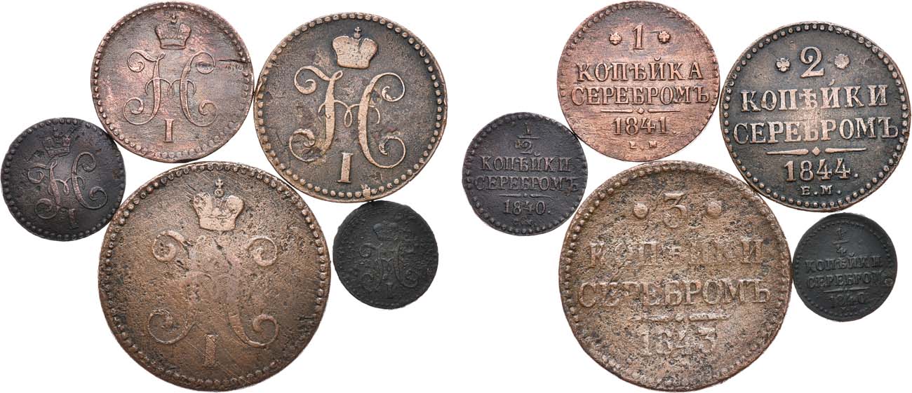 Медь. 1/2 копейки 1840 года. СМ. 4,99 г. 1/4 копейки 1840 года. ЕМ. 3,11 г. 1 копейка 1841 года. ЕМ. 12,58 г. 3 копейки 1843 года. 29,00 г. 2 копейки 1844 года. ЕМ. 19,66 г.