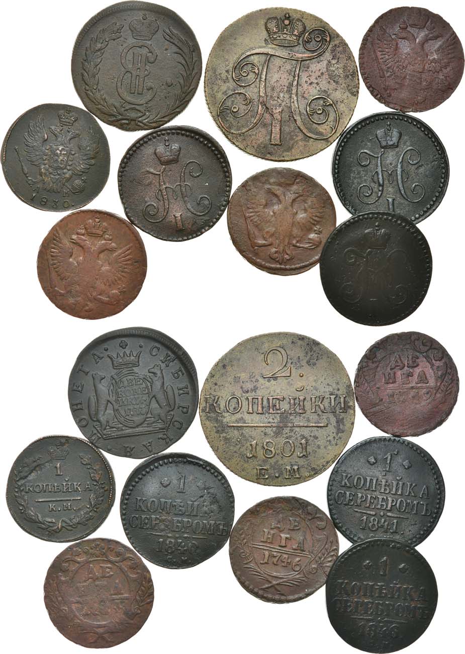 Медь. Россия 2 копейки 1801 ЕМ. Медь. Вес 17,24 гр. Россия. Сибирь 2 копейки 1777 КМ. Медь. Вес 10,86 гр. Россия 1 копейка 1830 КМ-АМ. Медь. Вес 5,45 гр. Россия 1 копейка 1840 СМ. Медь. Вес 7,67 гр. Россия 1 копейка 1841 СМ. Медь. Вес 8,55 гр. Россия 1 копейка 1846 СМ. Медь. Вес 8,33 гр. Россия деньга 1746. Медь. Вес 8,46 гр. Россия деньга 1749. Медь. Вес 5,72 гр. Россия деньга 17?4. Медь. Вес 7,42 гр.