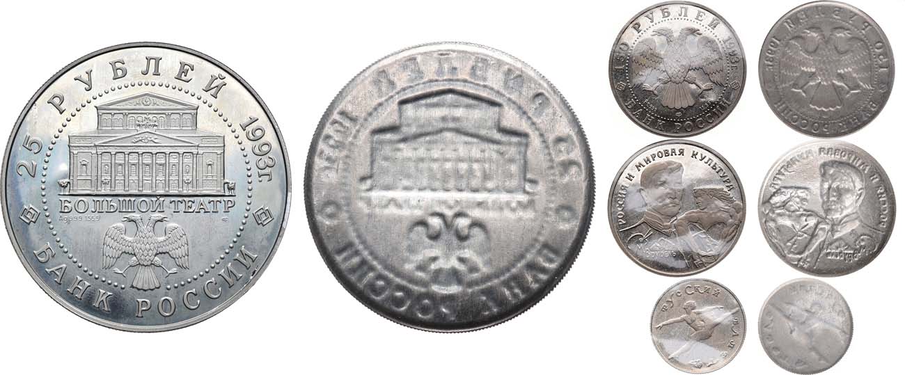 Односторонний оттиск 25 рублей 1993 года. Русский балет. Медно-никелевый сплав. Ленинградский монетный двор. Гурт рубчатый. PROOF. Отчеканены по технологии PROOF. Зеркальные поля. Чёткий матовый рельеф. Редка. Односторонний оттиск серебряной монеты номиналом 25 рублей в белом металле. Односторонний оттиск 150 рублей 1993 года. Медно-никелевый сплав. Ленинградский монетный двор. Гурт рубчатый. PROOF. Отчеканены по технологии PROOF. Зеркальные поля. Чёткий матовый рельеф. Редка. Односторонний оттиск платиновой монеты номиналом 150 рублей в белом металле. Односторонний оттиск 150 рублей 1994 года. Россия и мировая культура. М.А.Врубель. Медно-никелевый сплав. Ленинградский монетный двор. Гурт рубчатый. PROOF. Отчеканены по технологии PROOF. Зеркальные поля. Чёткий матовый рельеф. Редка. Односторонний оттиск платиновой монеты номиналом 150 рублей в белом металле. Односторонний оттиск 50 рублей 1993 года. Русский балет. Медно-никелевый сплав. Ленинградский монетный двор. Гурт рубчатый. PROOF. Отчеканены по технологии PROOF. Зеркальные поля. Чёткий матовый рельеф. Редка. Односторонний оттиск платиновой монеты номиналом 50 рубля в белом металле.