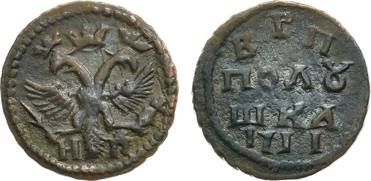 Медь. 1,01г. Набережный монетный двор. Реверс: ошибочно поставлена дата "1711" вместо "1718". Отсутствует у Узденикова, Биткина, Ильина. Дьяков 377, 3905(R1). Brekke 26, 45. XF+.