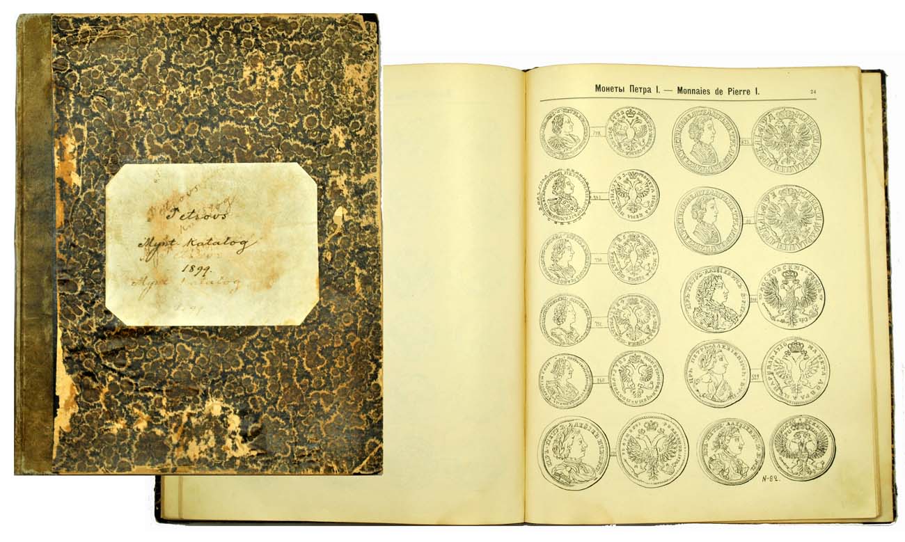 Москва, 1899 г. 86 стр., 46 стр. илл. Торговый каталог. В доступной форме передаёт информацию о существующих разновидностях русских монет и ценах на них в 1899 году.