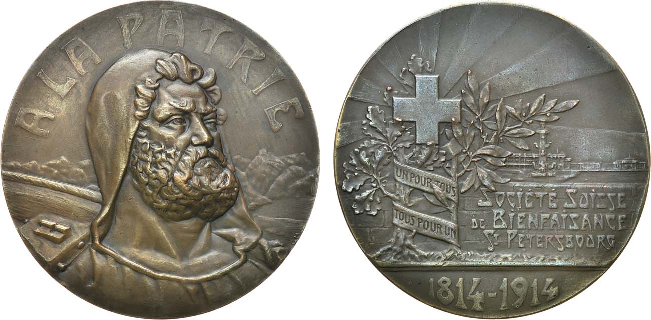 Бронза. 62,89г. Диаметр 52 мм. Западная Европа 1914 год. Неизвестный медальер (аверс — справа внизу у окружности: "СМ."). Дьяков 1574.1(R4). AU/UNC.