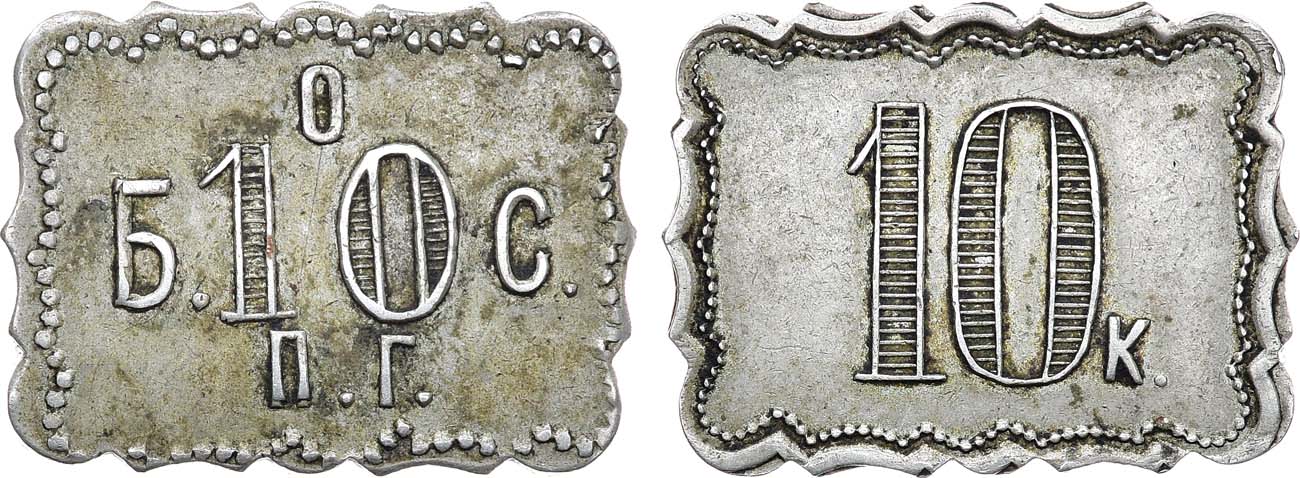 Белый металл. 4,79г. Размеры 27х20 мм. Неизвестная мастерская. На аверсе аббревиатура: "Б.О С. П.Г.". Тункель 38. AU/UNC.