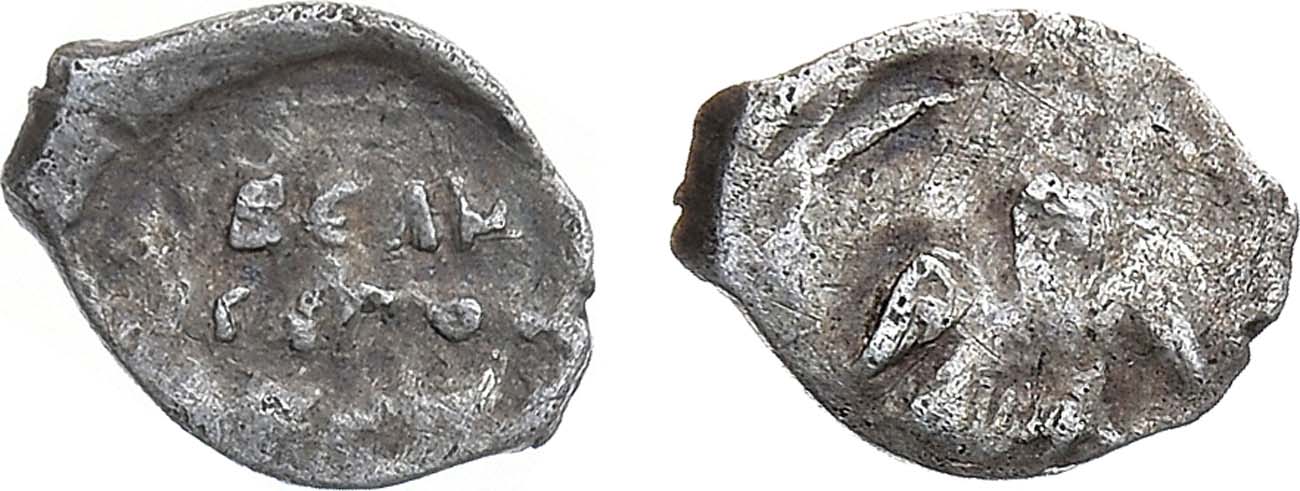 Серебро. 0,15г. Чеканка в Новгороде. Аверс: русская строчная легенда. Реверс: птица вправо. ГП2 8290 (R-IX). AU.