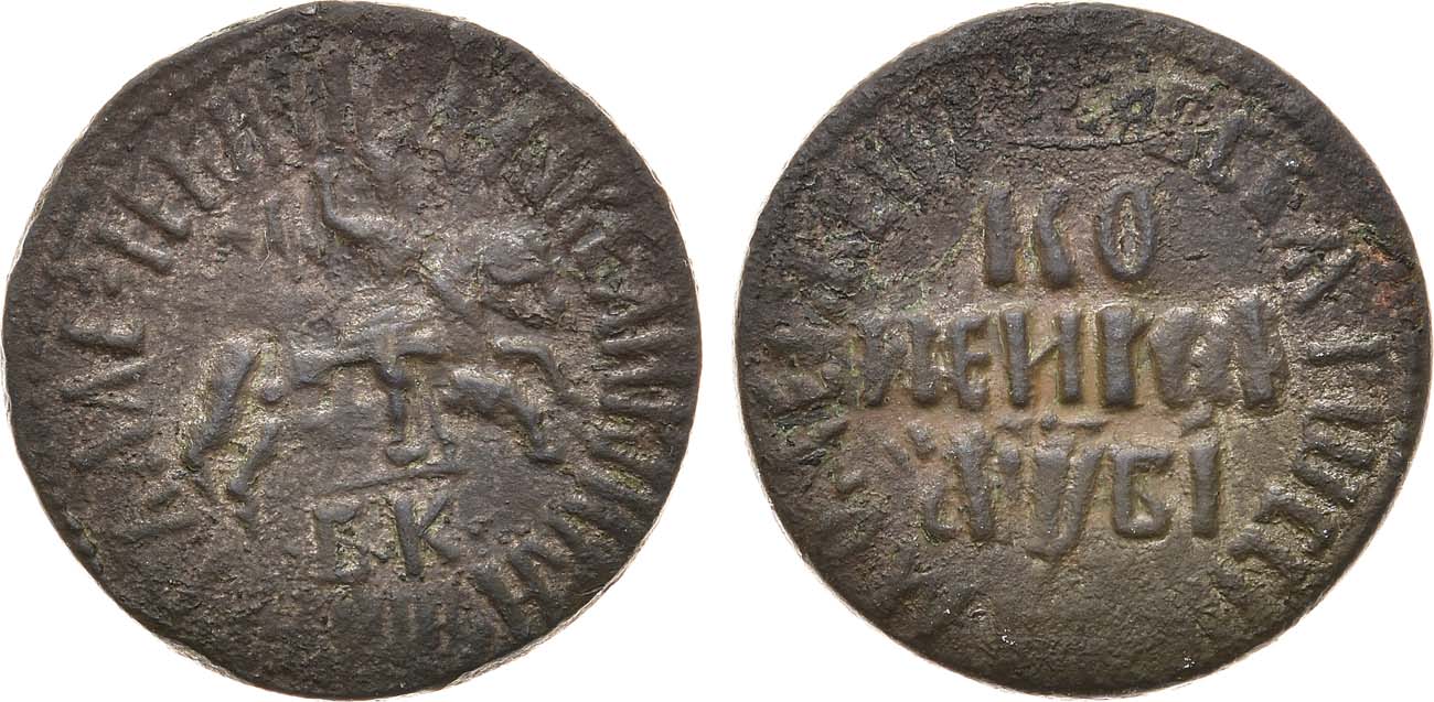 Медь. 8,33г. Набережный монетный двор. Аверс: вверху точка. Реверс: вверху точка. Уздеников 2325. Биткин 2446(R). Дьяков 99, 3427(R0). Brekke 32, 217. VF.