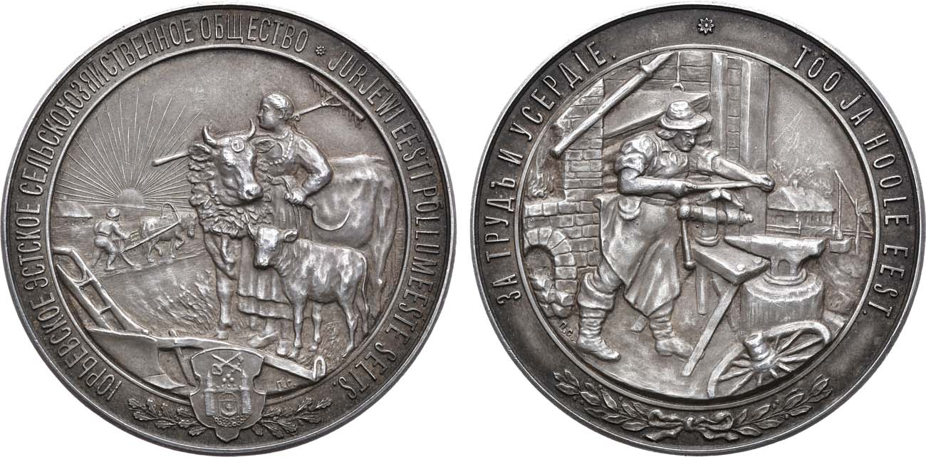 Серебро. 50,80г. Диаметр 46,8 мм. Санкт-Петербургский монетный двор. Медальер П.Г. Стадницкий (аверс — внизу, справа от герба: "П.С."; реверс — внизу слева у ноги кузнеца: "П.С."). Смирнов 1229. Дьяков 1340.1(R3). UNC.