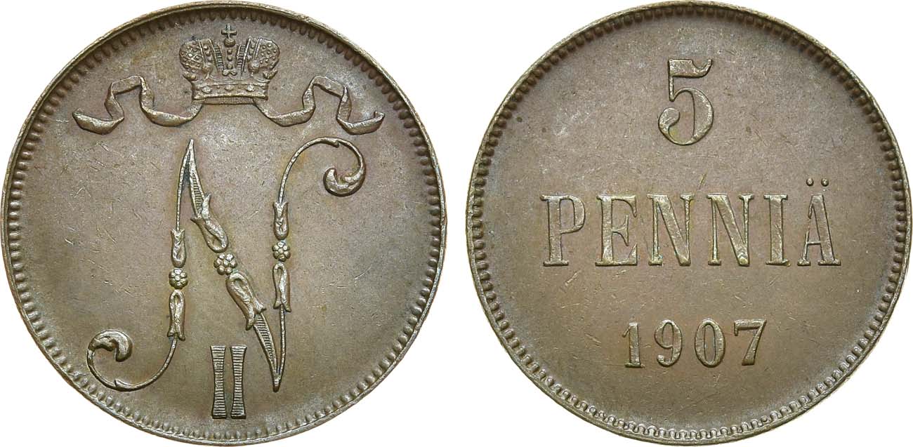 Медь. 6,38г. Для Финляндии. Гельсингфорсский монетный двор. Уздеников 4789. Биткин 448. Казаков 339. UNC.