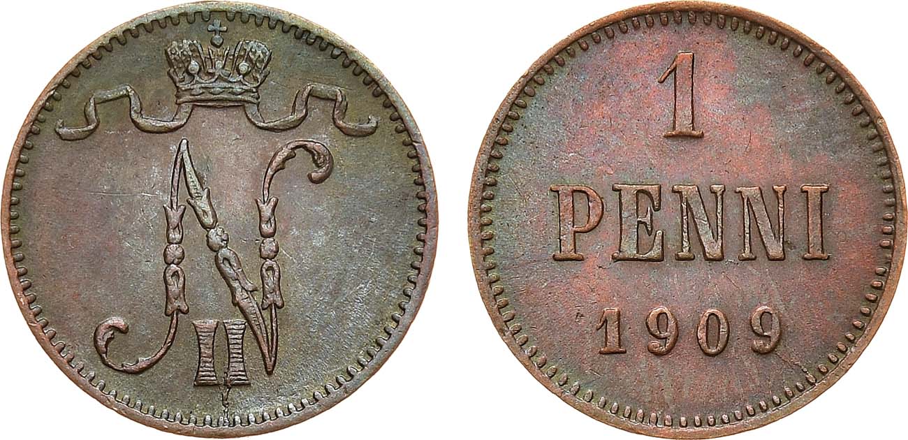 Медь. 1,27г. Для Финляндии. Гельсингфорсский монетный двор. Уздеников 4800. Биткин 470. Казаков 375. AU/UNC.