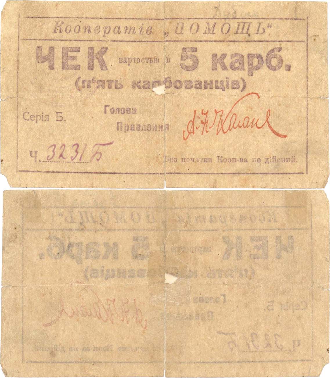 Серия Б, №323/Б. На пергаментной бумаге. Круглая печать кооператива: "Еврейское Потребительское Общество. Дубно. Помощь". Рябченко №14230. F/F+.