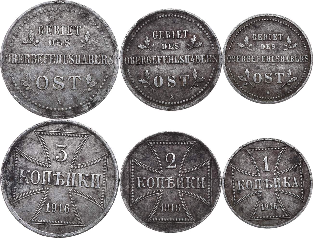 Железо. 1 копейка 1916 года. Бона германской оккупации. (А) Берлин. Железо. 2,87 г. Уздеников 4948. Биткин 6. XF. 2 копейки 1916 года. Бона германской оккупации. (А) Берлин. Железо. 5,76 г. Уздеников 4946. Биткин 4. XF. 3 копейки 1916 года. Бона германской оккупации. (А) Берлин. Железо. 8,66 г. Уздеников 4944. Биткин 1. XF. XF.