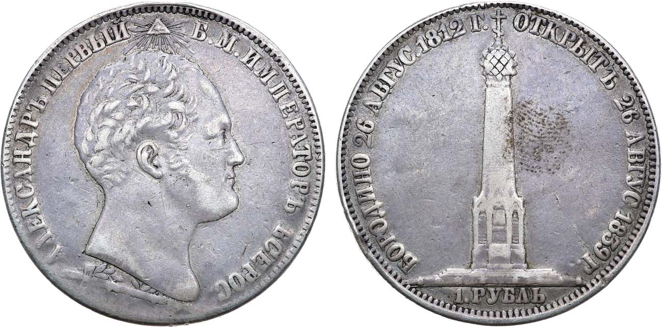 Серебро. 20,46г. Чеканен по случаю открытия памятника-часовни на Бородинском поле. В обрезе шеи: "H. GUBE F." Уздеников 4185(•). Биткин 895(R). 2 рубля 25 копеек по Петрову. VF.