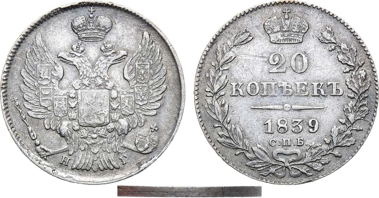 Гурт монеты представляет собой сплошную волнообразную вдавленную полосу без стандартных вдавленных косых насечек. Также на гурте присутствует явный выпуклый след от разъёмного кольца. * Аверс и реверс 20 копеек 1839 года со стандартным гуртовым оформлением описаны у Биткина под № 321, у Узденикова - под № 1589. Требует дальнейшего изучения и каталогизации.