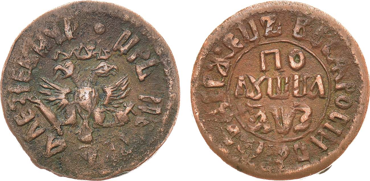 Медь. 1,65г. Набережный монетный двор. Аверс: без линейного ободка, вверху точка. Реверс: вверху ничего нет. Уздеников 2289. Биткин 2904 (R1). Дьяков Не описана у Дьякова. Brekke 26, 30. XF+/AU.