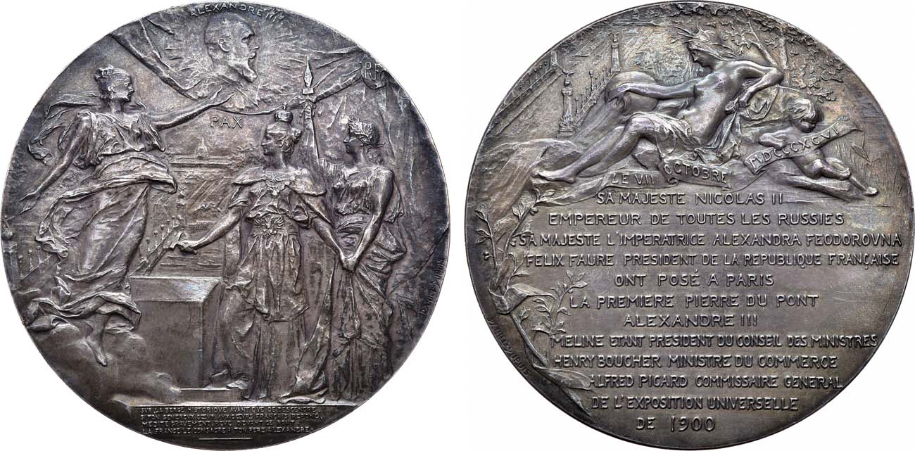 Бронза, серебрение. 133,52г. Диаметр 69 мм. Франция, Парижский монетный двор. Медальер Ж.Б. Даниель-Дюпюи. Аверс: справа на поле "DANIEL-DUPUIS". Реверс: слева внизу на поле "DANIEL-DUPUIS". Клейма на гурте внизу: «BRONZE», и рог изобилия. Дьяков 1320.1(R1). UNC.