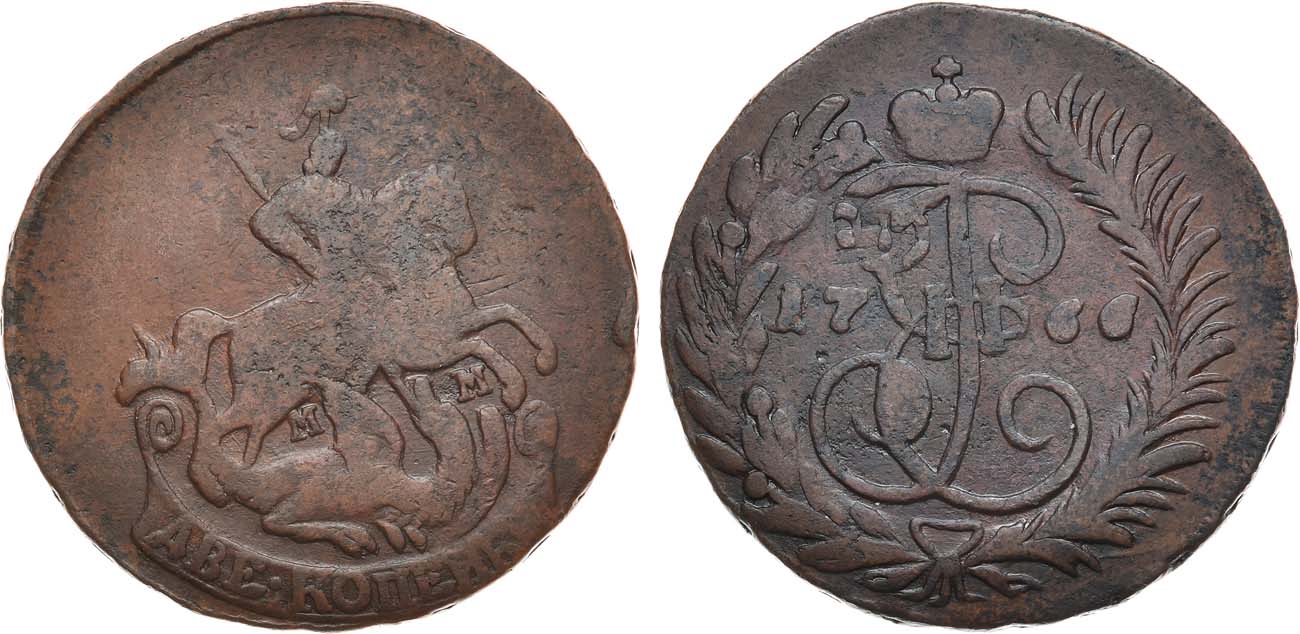 Медь. 19,40г. Красный монетный двор. Перечекан из 4 копеек 1762. Аверс: "ММ" под конем. Уздеников 2683. Биткин 534. Дьяков 55, 149. Brekke 117, 153. VF.