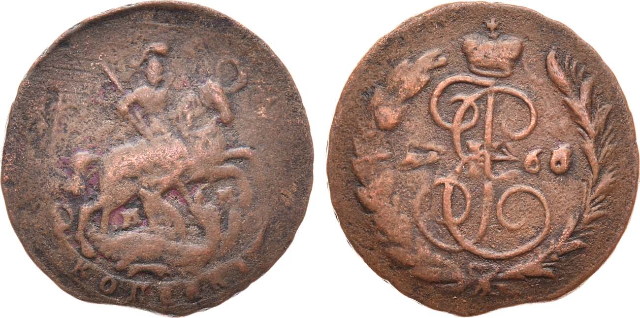 Медь. 7,21г. Красный монетный двор. Перечекан из 2 копеек 1762 года. Уздеников 2687. Биткин 544. Дьяков 57, 154. Brekke 116, 116(–). VF.