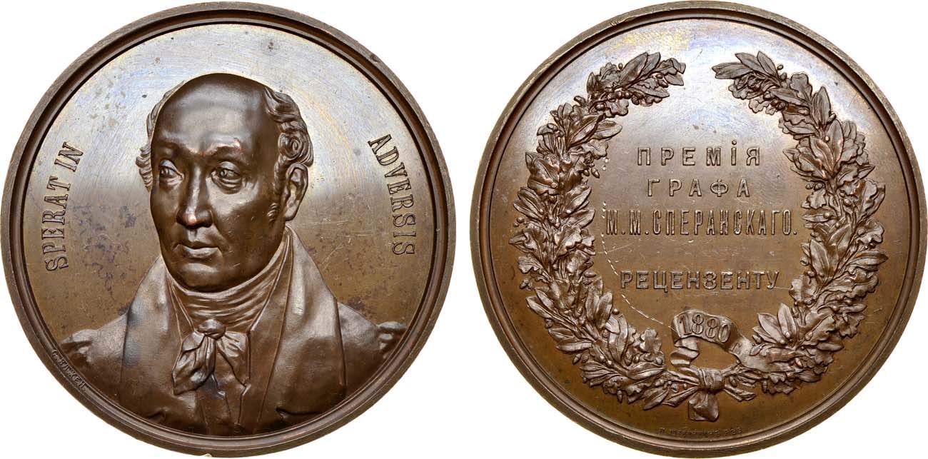 Бронза. 118,40г. Диаметр 65,9 мм. Санкт-Петербургский монетный двор. Медальеры С.З. Важенин и Л.Х. Штейнман (аверс — слева внизу на канте: "С.ВАЖЕН.", реверс — внизу на поле: "Л.ШТЕЙНМАНЪ РѢЗ."). Смирнов 792. Дьяков 874.1(N1). UNC.