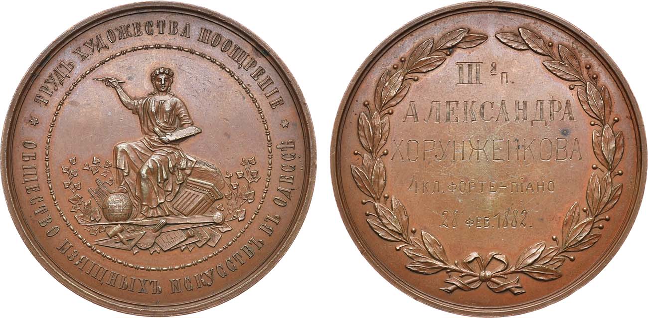 Общество изящных искусств было основано в Одессе в 1865 г. и осуществляло деятельность по подготовке художественных кадров до 1918 г. Медалями отмечались успехи учеников Школы рисования (1865–1900, с 1900 — Художественное училище) и Музыкальной школы (1866–1886), находившихся на попечении общества.