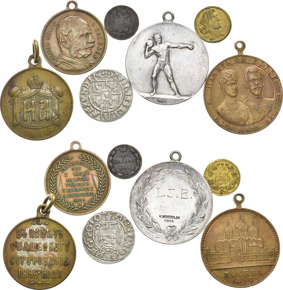 Речь Посполитая. Король польский и великий князь литовский Сигизмунд III. Полторак (1/24 талера) 1623 года. Монетный двор Быдгош. Серебро. 1,16 г. Kopicki 862. XF. Саксония. Медаль 1904 года. В память освящения флага Саксонского военного клуба Грехвица и окрестностей. Диаметр 24 мм. Бронза. 4,74 г. С портретом короля Саксонии Георга. Россия. Медаль 1896 года. Бронза. 8,02 г. Диаметр 26 мм. В память священного коронования Николая II и Марии Фёдоровны. С кольцом для подвески. Частная мастерская. Россия. Медаль 1896 года. Бронза, золочение. 9,85 г. Диаметр 28 мм. В память священного коронования Николая II и Марии Фёдоровны. Собор Христа Спасителя Москва. Частная мастерская. Латвийская Буржуазная республика. Спортивная медаль. Диаметр 30 мм. Белый металл. 9,58 г. Мастерская К. Вихтолин, Рига, 1920-е гг, гравировка "L.Z.B.". Россия. Жетон 15 копеек 1889 года. Диаметр 12,5 мм. Железо. 0,58 г. Россия. Жетон "РУСЬ". Диаметр 13 мм. Жёлтый металл. 0,34 г.