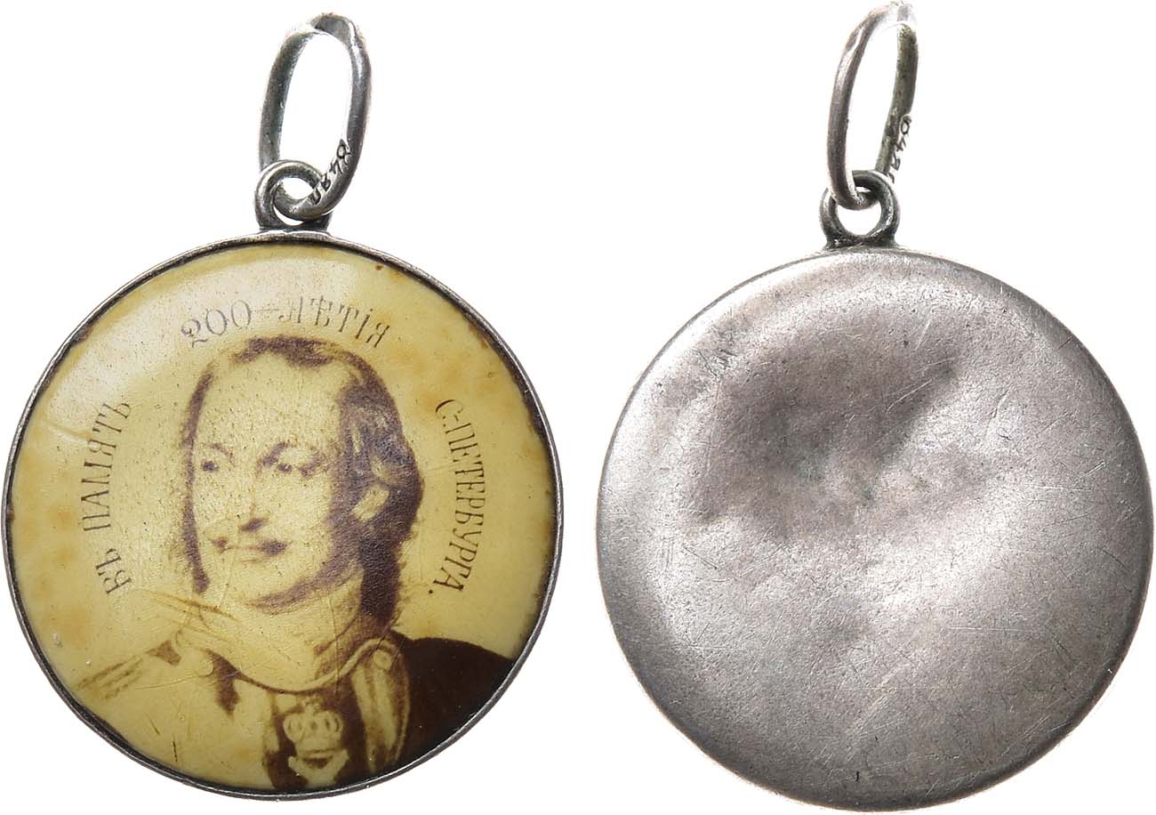 Серебро. 1,86г. Диаметр 19 мм. Неизвестная мастерская. Аверс: фотопортрет Петра I с живописного оригинала. Клейма на подвесном кольце: 1. Санкт-Петербургского окружного пробирного управления 1899-1904 гг. в виде лопатки "84 ЯЛ" (инициалы пробирного инспектора Я. Ляпунова в 1899-1904 гг). 2. Фирменное неразборчиво. Российская Империя, Санкт-Петербург, 1903 г. AU.