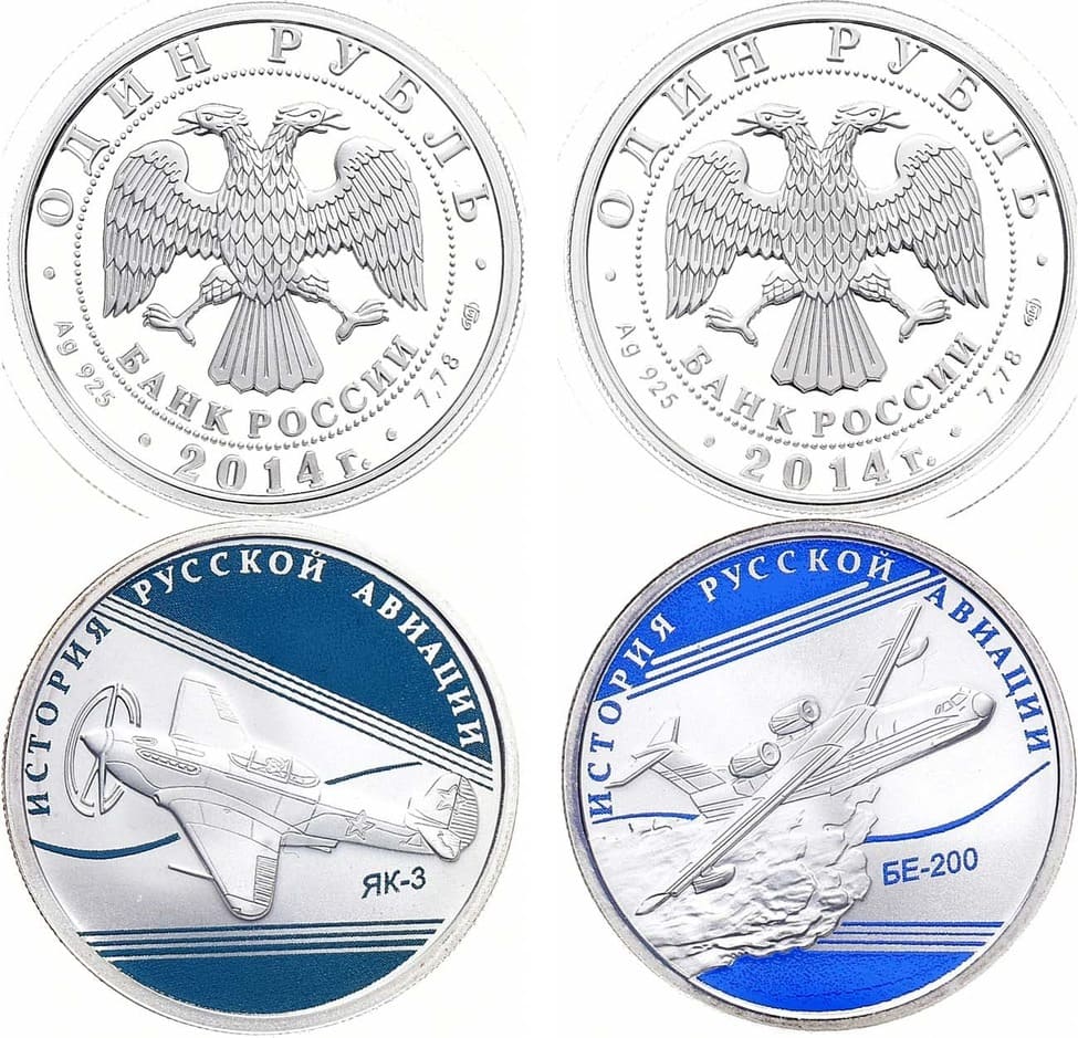 Серебро. Санкт-Петербургский монетный двор. 1 рубль 2014 года. История русской авиации - БЕ-200. 8.53 г. Проба 925. Тираж 5000 экз. KM Y 1565. Цветная эмаль. PROOF. 1 рубль 2014 года. История русской авиации - ЯК-3. 8.53 г. Проба 925. Тираж 5000 экз. KM Y 1564. Цветная эмаль. PROOF. PROOF.