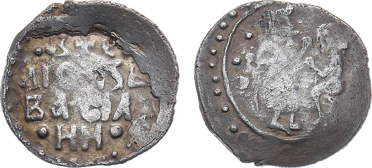 Серебро. 0,70г. Аверс: русская строчная легенда. Реверс: сцена оммажа, точки за князем. ГП2 1515C (R-II). XF+/AU.