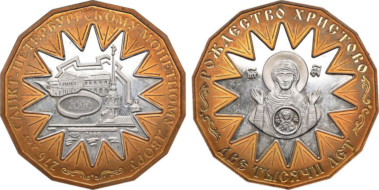 Томпак, мельхиор. 56,76г. Размер 49х49 мм (14-ти угольник). Санкт-Петербургский монетный двор. Медальер С.А. Корнилов. Гурт рубчатый. Тираж 1000 экз. Глейзер-2017, с. 102. PROOF.