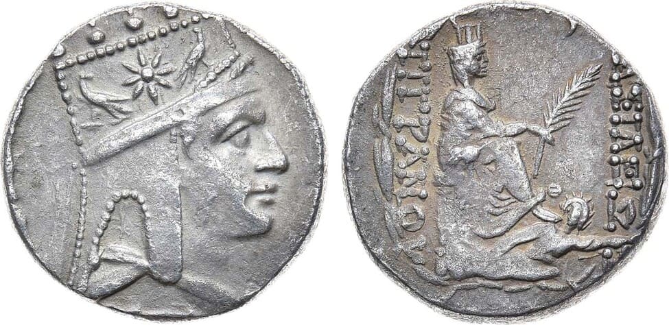Серебро. 15,65г. Тигранокерт. Аверс: Тигран II в диадеме, украшенной звездой между двумя орлами. Реверс: легенда "BAΣIΛEΩ-Σ / TIΓPANOY"; Тихе, сидящая на камне с лавровой ветвью в руке; внизу — речной бог Оронт, плывущий вправо; изображение в венке. VF/XF.