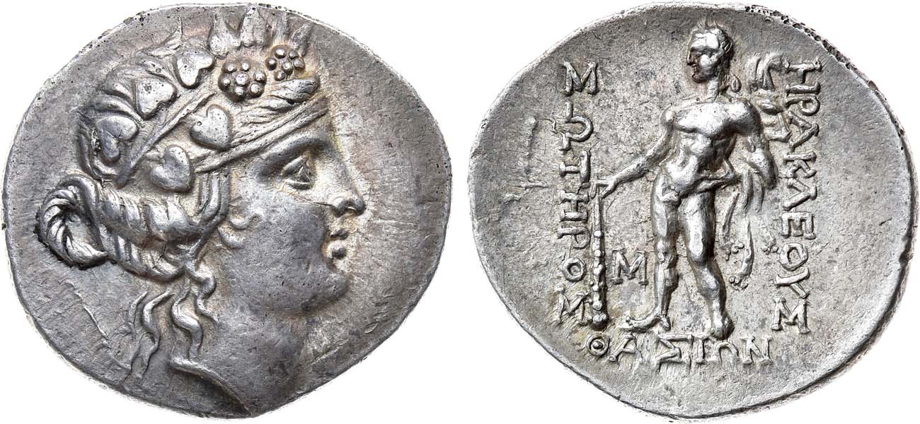 Серебро. 16,96г. Аверс: голова Диониса в короне вправо. Реверс: стоящий анфас Геракл в львиной шкуре и с дубинкой в руке; легенда "ΗΡΑΚΛΕΟYΣ / ΣΩΤΗΡΟΣ / ΘΑΣΙΩΝ". AU.