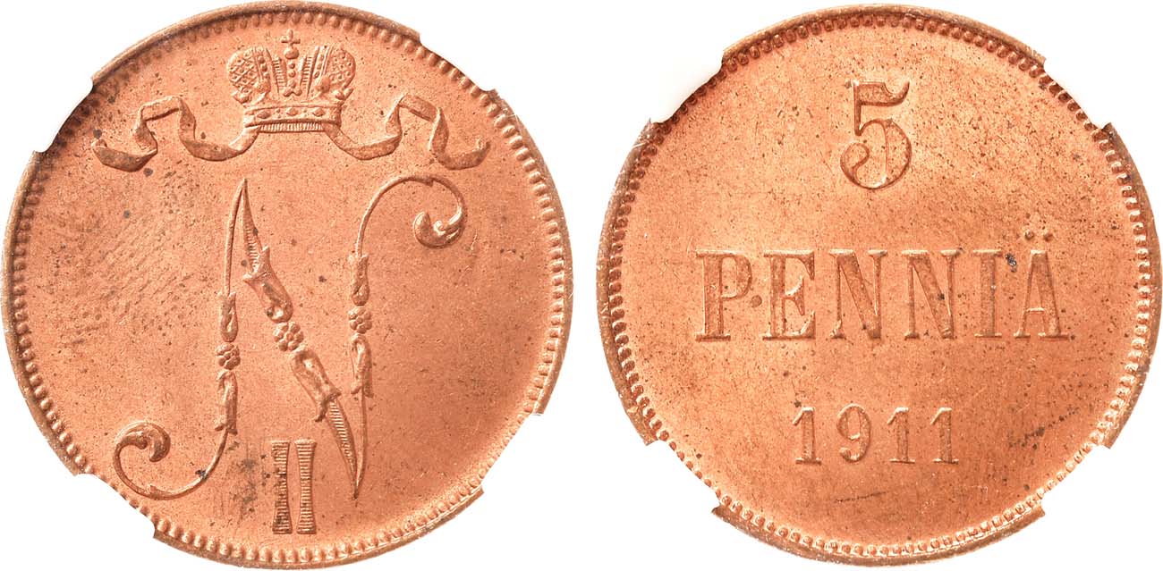 Медь. Для Финляндии. Гельсингфорсский монетный двор. Уздеников 4808. Биткин 451. Казаков 357. MS 65 RB.