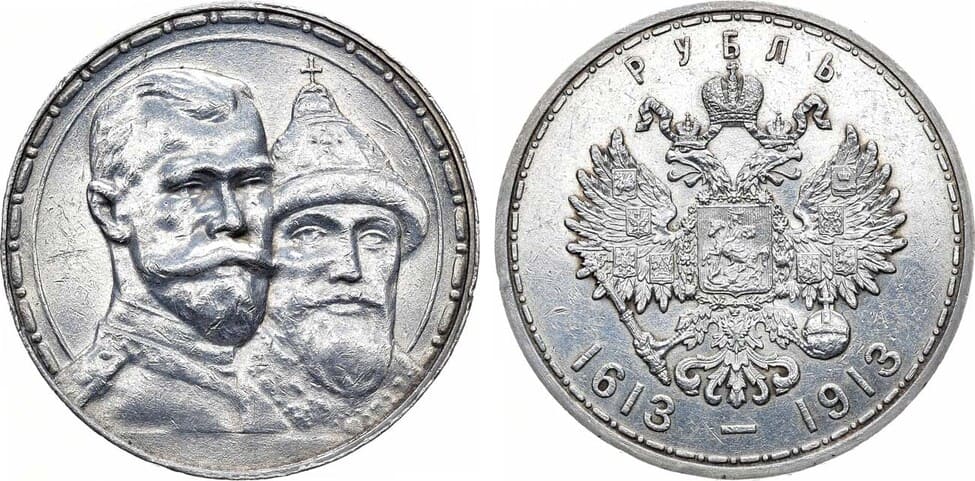 Серебро. 19,98г. Чеканен в память 300-летия Дома Романовых. Аверс: выпуклый чекан. Уздеников 4194. Биткин 336. Казаков 454. AU.