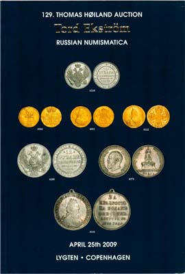Копенгаген, 25 апреля 2009 года. 408 лотов. Распродажа очень серьезной коллекции потомственного нумизмата и историка Торда Экстрема. В коллекцию вошли редкие русские монеты, медали, знаки, ордена и боны, в том числе "сестрорецкий" рубль, xчервонцы Анны Иоанновны, Елизаветы Петровны и Петра III, золотая медаль 1724 года в честь коронации Екатерины I, подборка платиновых монет Николая I.