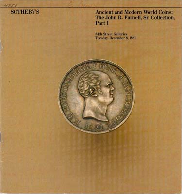 8 декабря 1981 года, Нью-Йорк. 462 лота. Представлены лоты из коллекции Джона Фарнелла и других коллекционеров. Небольшая, но очень интересная коллекция русских монет, включая самую знаменитую русскую монету "Константиновский" рубль 1825 года. Вариант с гладким гуртом. Именно этот экземпляр монеты будет продан на аукционе Stack's&Bowers в Гонконге 6 апреля 2021 года.