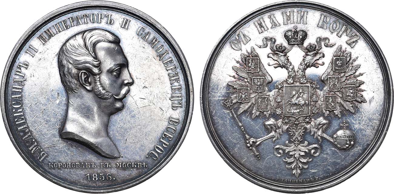 Серебро. 75,93г. Диаметр 50,5 мм. Санкт-Петербургский монетный двор. Аверс: медальер В.В. Алексеев (на обрезе шеи: "В.АЛЕКСѢЕВЪ Р."). Реверс: Р.Р. Ганнеман (внизу у окружности: "Р.ГАННЕМАНЪ Р."). Смирнов 603/б. Дьяков 653.2(R2). AU/UNC.