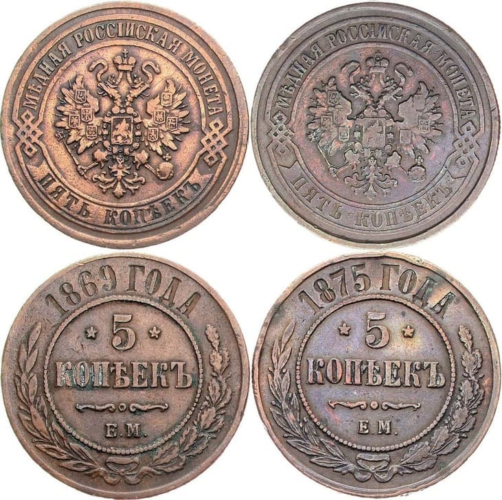 Медь. 5 копеек 1869 года. ЕМ. Диаметр 33 мм. Вес 16,23 г. Екатеринбургский монетный двор. Биткин 394. VF/XF. 5 копеек 1875 года. ЕМ. Диаметр 33 мм. Вес 15,66 г. Екатеринбургский монетный двор. Биткин 400. VF.