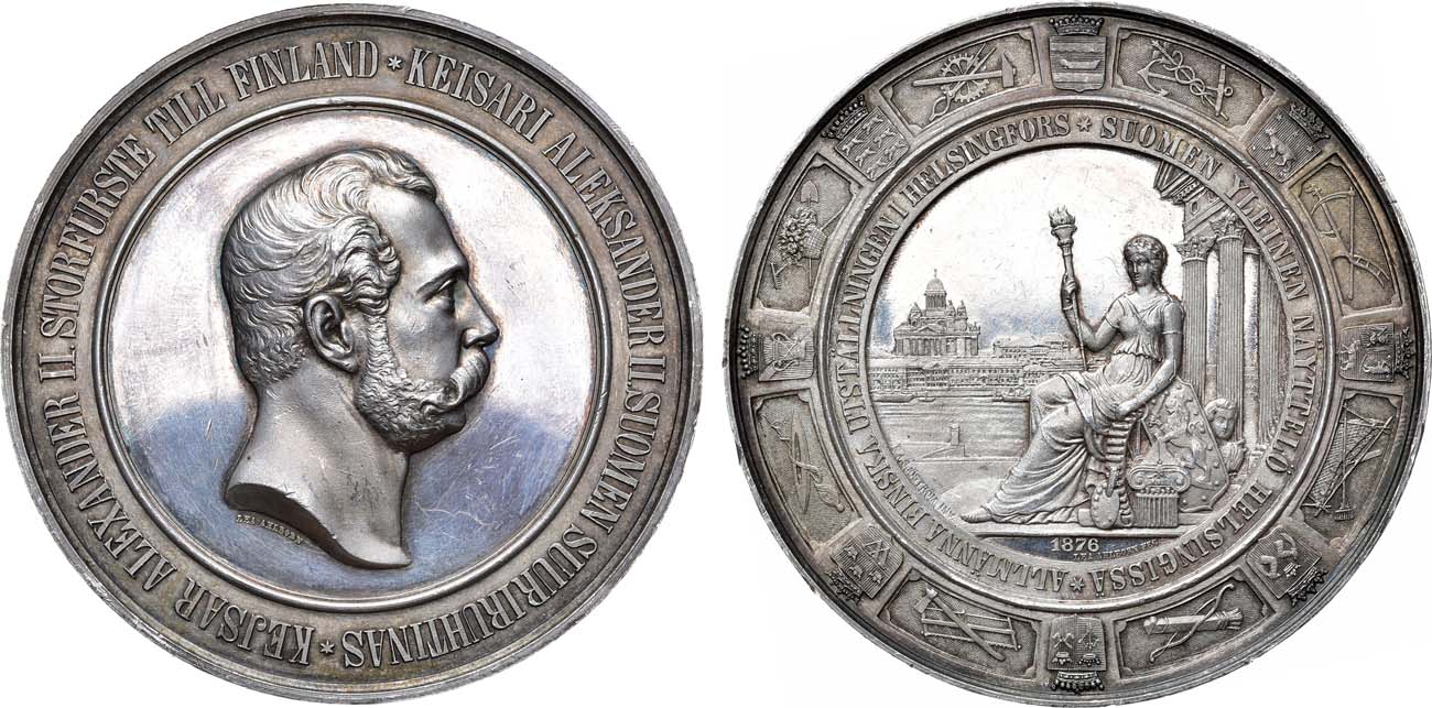 Серебро. 108,6г. Диаметр 64,4 мм. Гельсингфорсский монетный двор. Медальер Л. Альборн (аверс — под обрезом изображения: "LEA AHLBORN"; реверс — в обрезе изображения справа внизу: "LEA AHLBORN FEC."). Реверс по эскизу архитектора Ф.А. Шёстрёма (на изображении слева внизу по окружности: "F.A.SJÖSTRÖM INV."). Дьяков 832.1(R2). UNC.