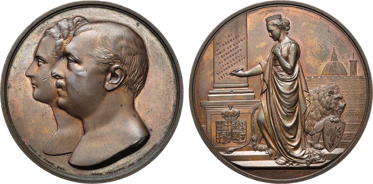 Бронза. 113,86г. Диаметр 59,5 мм. Италия. Флоренция, 1879 г. Аверс: медальер Дж. Ванетти по эскизу У. Камби (внизу: "PROF. U.CAMBI MOD. GIOV. VAGNETTI INC."). Реверс: медальер A. Фарнези по эскизу У. Камби (под обрезом изображения: "PROF. U.CAMBI MOD. FARNESI I."). Дьяков 853.1(R1). UNC.