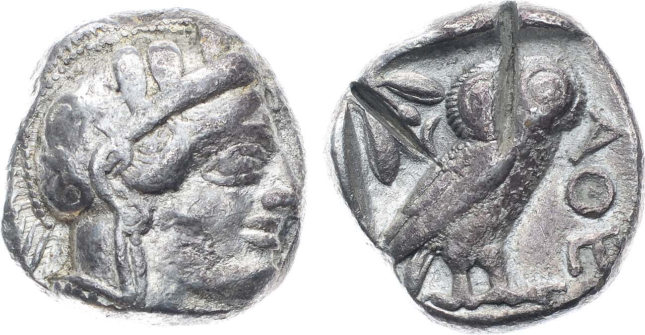 Серебро. 16,98г. Афины. Аверс: голова Афины "классического стиля" в аттическом шлеме вправо. Шлем украшен оливковыми листьями, в ухе богини серьга, на шее ожерелье. Реверс: "АʘЕ", сова стоит вправо, слева от нее оливковая ветвь и полумесяц. VF.