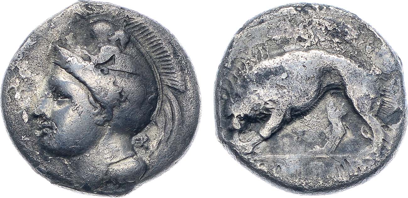 Серебро. 6,84г. Элея (Велия). Аверс: голова Афины, обращенная влево, во фригийском шлеме, украшенном кентаврессой, монограмма за шейным щитком. Реверс: лев влево, терзающий добычу, под ним монограмма. VF-.
