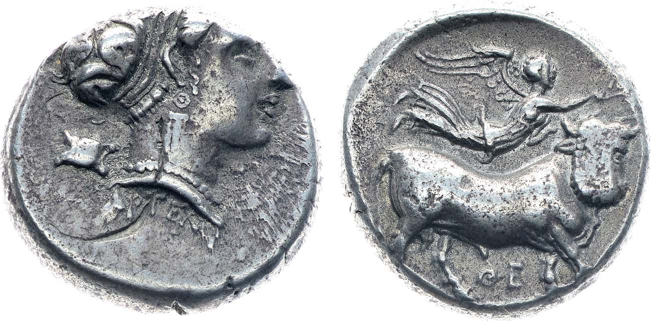 Серебро. 7,32г. Неаполис. Аверс: голова нимфы Партенопы слева, позади неё трофей. Реверс: летящая богиня Ника коронует быка. XF.