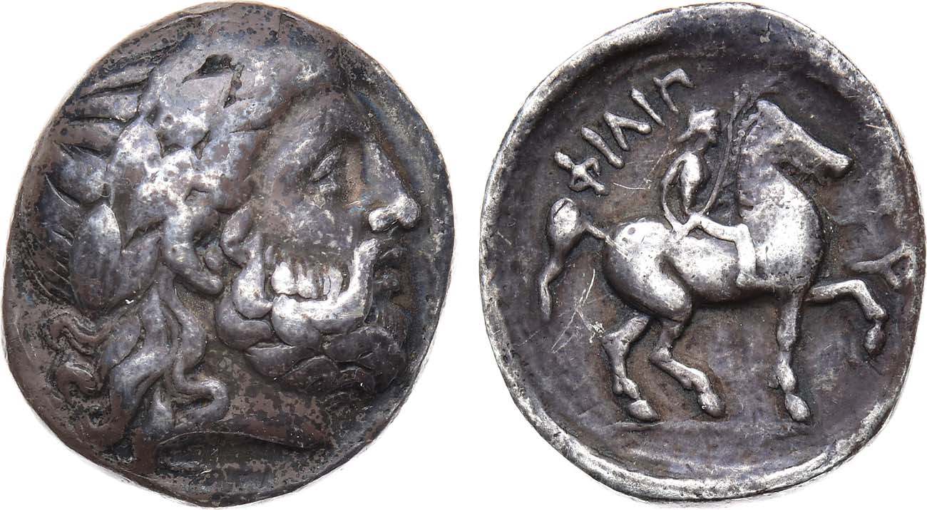 Серебро. 13,96г. Амфиполь. Аверс: бюст Зевса в лавровом венке вправо. Реверс: легенда на греческом, всадник вправо, в правой руке пальмовая ветвь. ANS 689. VF.