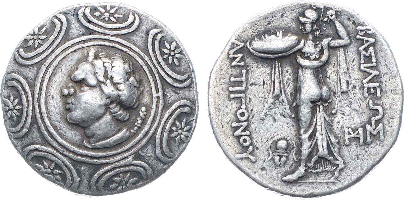 Серебро. 17,07г. Аверс: голова Пана с рогами влево внутри македонского щита. Реверс: фигура Афины с эгидой влево, со щитом в левой руке и молнией в правой; легенда "BAΣIΛEΩΣ - ANTIΓONOY". VF-.