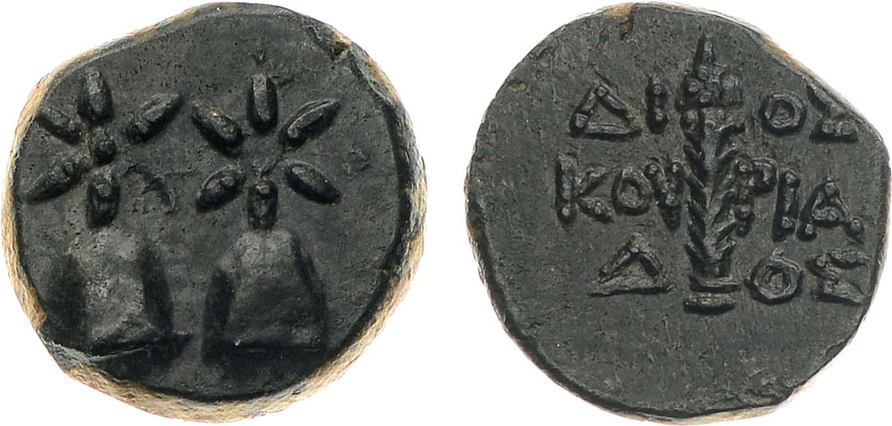 Бронза. 1,9г. Диоскуриада. Аверс: шапки Диоскуров, увенчанные звёздами. Реверс: тирс, разделяющий легенду "ΔΙ - ΟΣ / ΚΟV - ΡΙΑ / Δ - ΟΣ". AU.