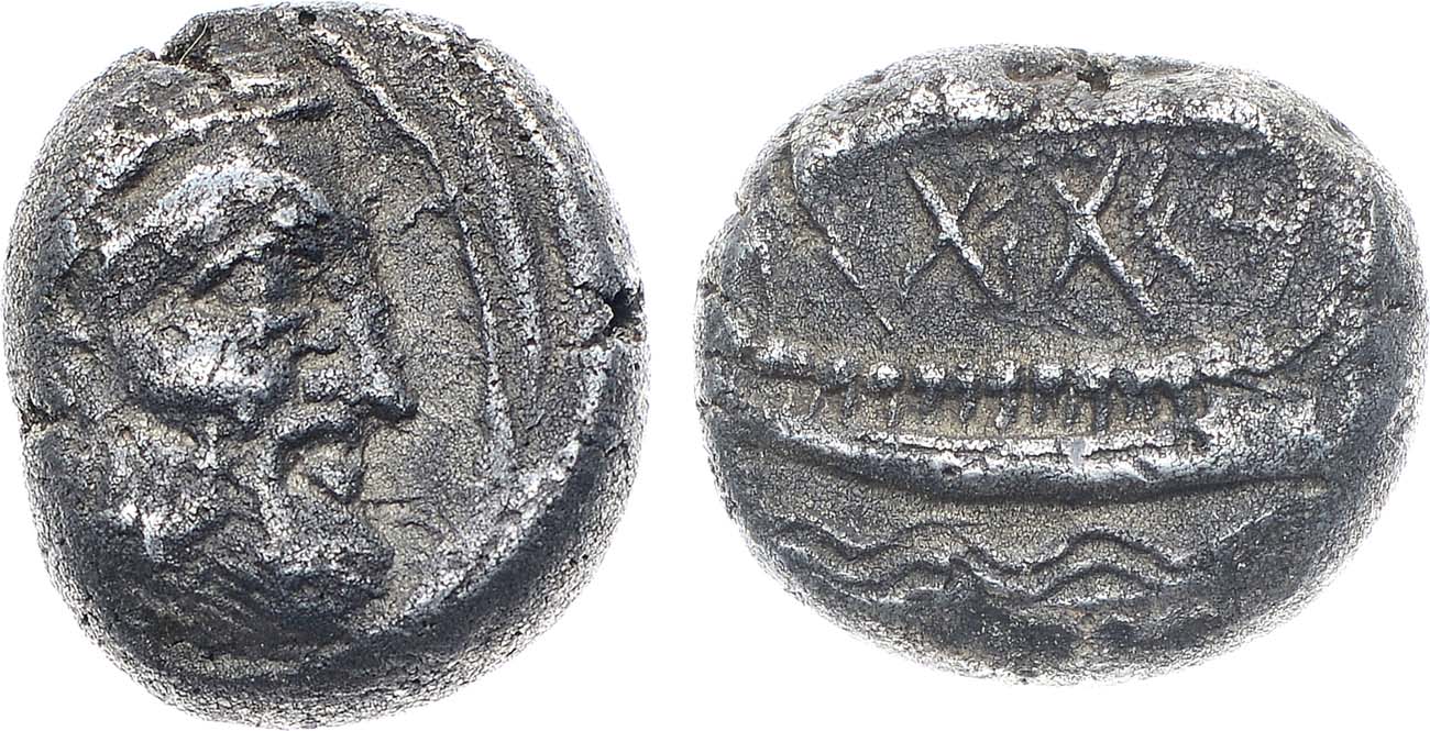Серебро. 10,36г. Арад. Аверс: голова Мелькарта вправо. Реверс: нос галеры, плывущей по волнам. VF-.