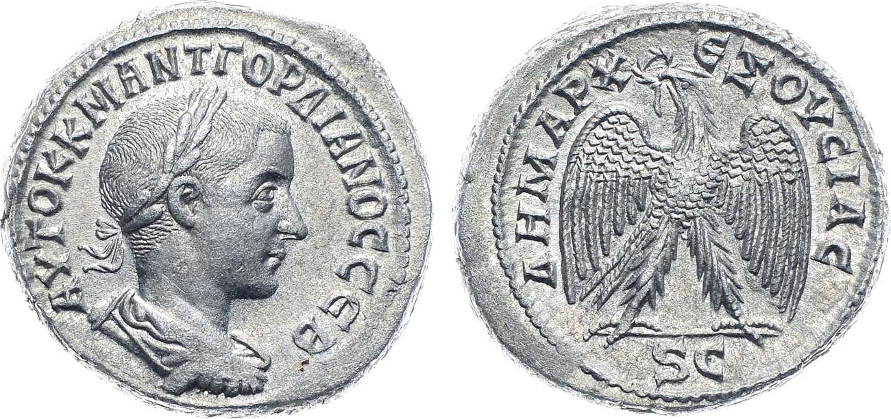 Серебро. 14,52г. Антиохия-на-Оронте. Аверс: круговая легенда "AYTOK K M ANT ΓOPΔIANOC CЄB"; портрет императора в лавровом венке вправо. Реверс: круговая легенда "ДHMAPX ЄΣOYCIAC"; изображение орла с венком в клюве влево; внизу "SC". AU.